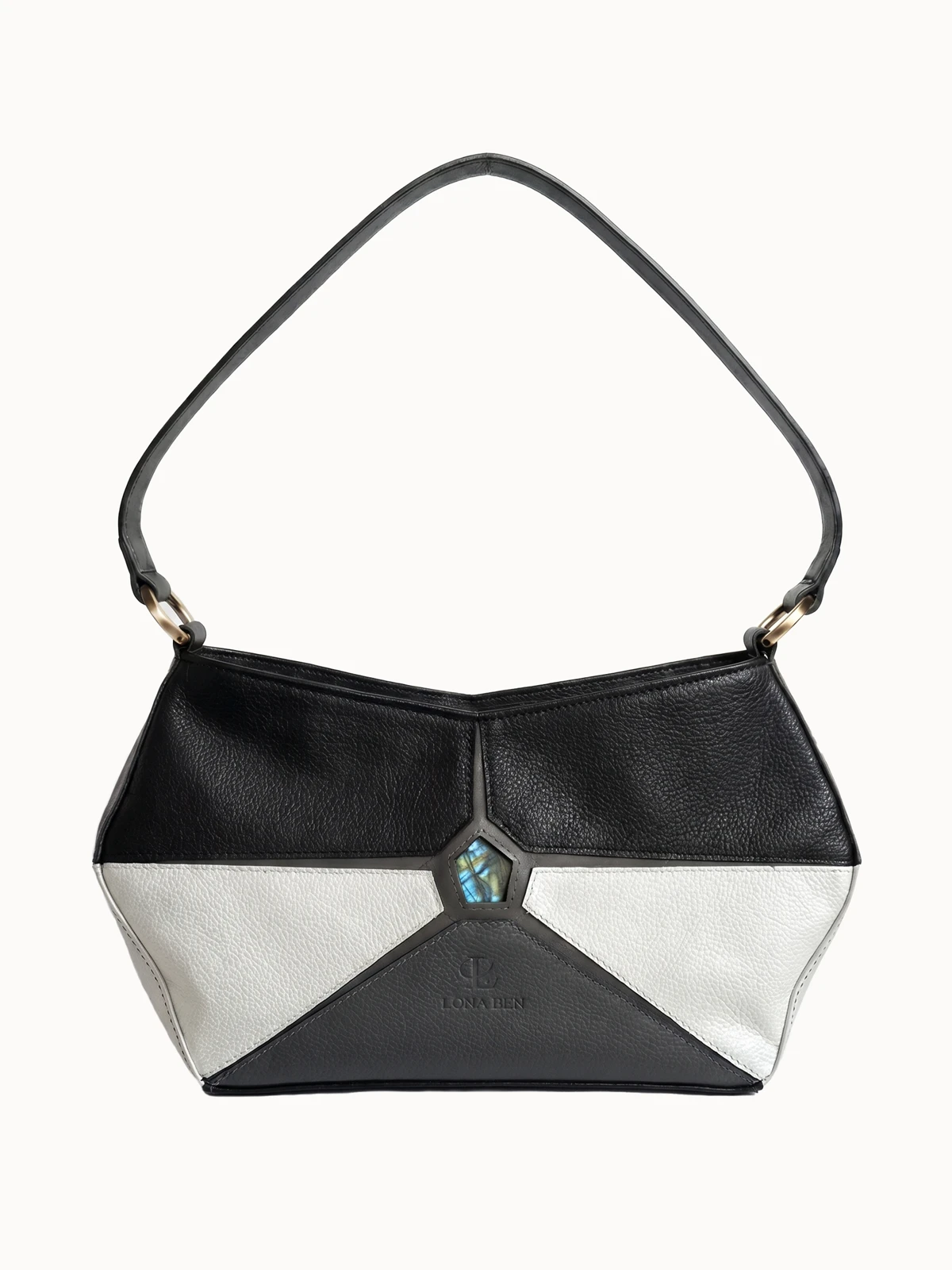 Natural Labradorite in a hexagonal shape with iridescent blue, green, and gold reflections. A unique mineral signature bringing protection and radiance to your silhouette.